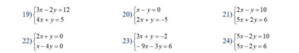 `19,` `{(3x-2y=12),(4x+y=5):}`