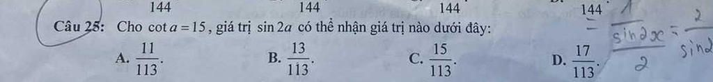 Vậy sin(2a) = $\frac{15}{113}$ => Chọn C