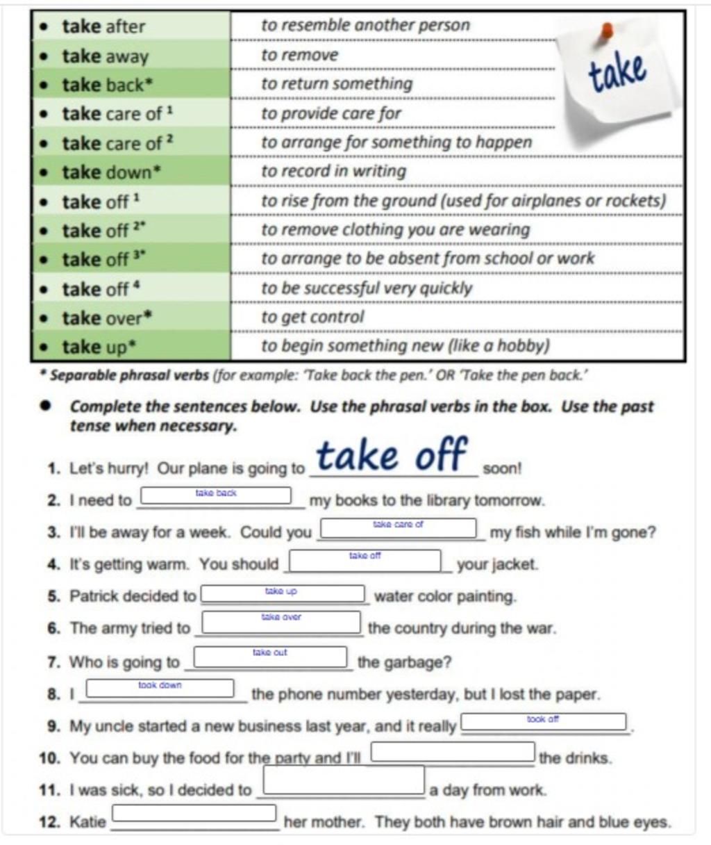 11. take off = to arrange to be absent from school or work: nghỉ làm, nghỉ học