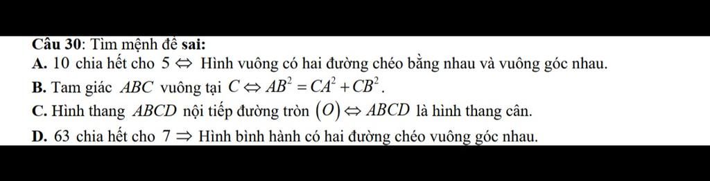 $\Rightarrow$ Mệnh đề $\textbf{D}$ sai