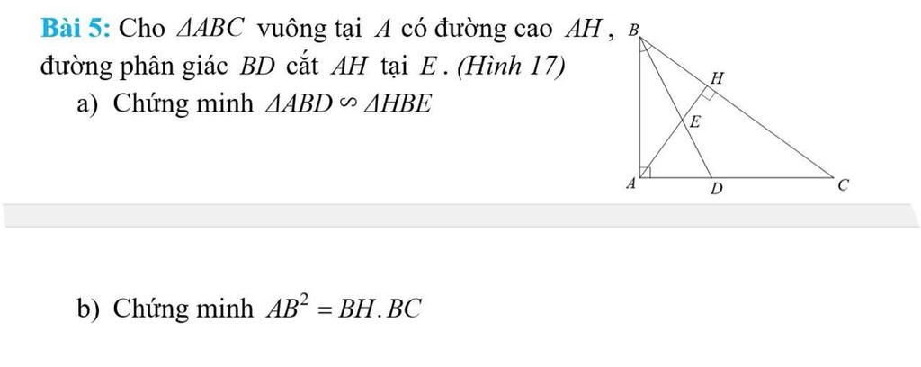 $\begin {cases} \widehat{ABD} = \widehat{HBE} (BD\text{ là phân giác của }\widehat{ABC}) \\ \widehat{BAD} = \widehat{BHE} (= 90^\circ)\end{cases}$