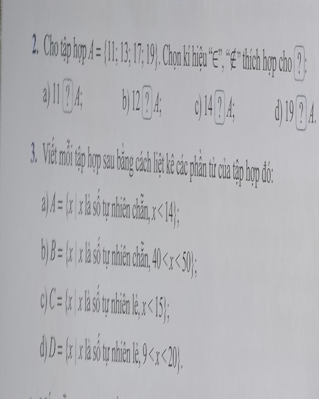 `a) A = {x | x` là số tự nhiên chẵn `x < 14}`