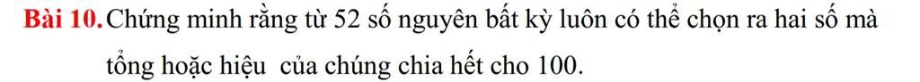 Từ 52 số nguyên bất kỳ, luôn tồn tại hai số sao cho: Tổng hoặc hiệu của chúng chia hết cho 100