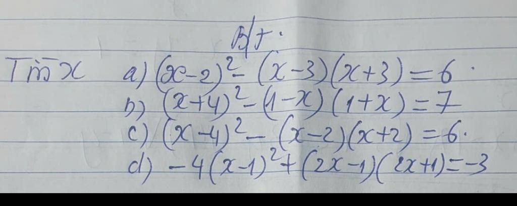`c)` `(x - 4)^2 - (x - 2)(x + 2) = 6`