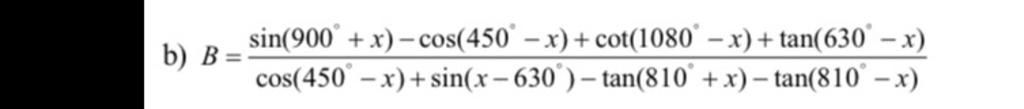 `B=(sin(900^@+x)-cos(450^@-x)+cot (1080^@-x)+tan(630^@-x))/(cos(450^@-x)+sin(x-630^@)-tan(810^@+x)-tan(810^@-x))`