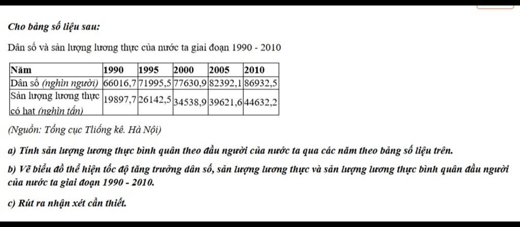 (Biết rằng dữ liệu dùng: dân số 1990=66.016,7; 1995=71.199,5; 2000=77.630,9; 2005=82.392,1; 2010=86.932,5 (nghìn người). Sản lượng 1990=19.897,7; 1995=26.142,5; 2000=34.538,9; 2005=39.621,6; 2010=44.632,2 (nghìn tấn).)