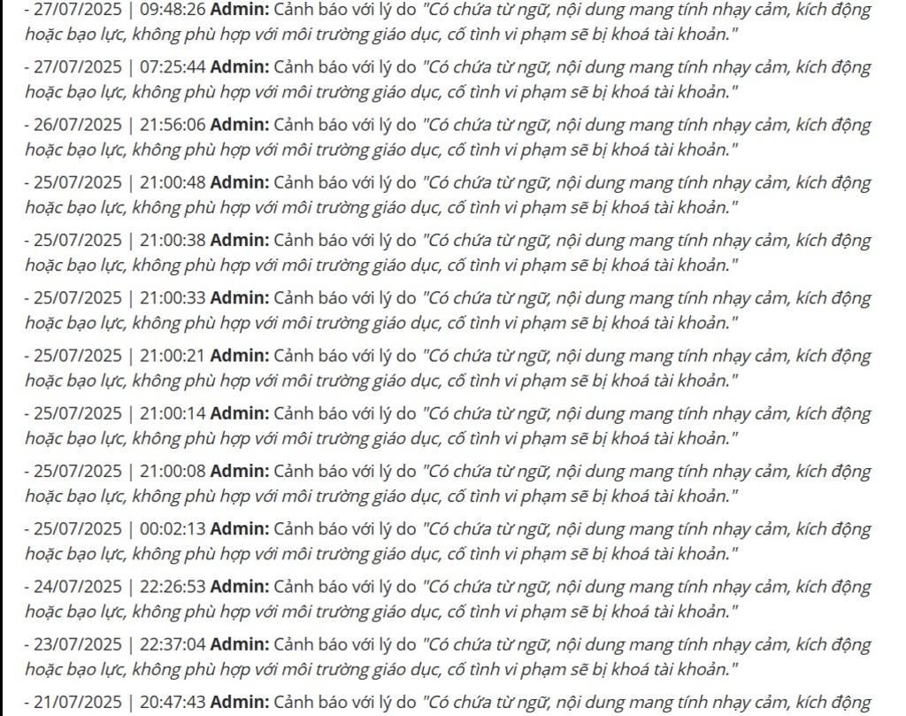 - 27/07/2025 | 09:48:26 Admin: Cảnh báo với lý do "Có chứa từ ngữ, nội dung mang tính nhạy cảm, kích động