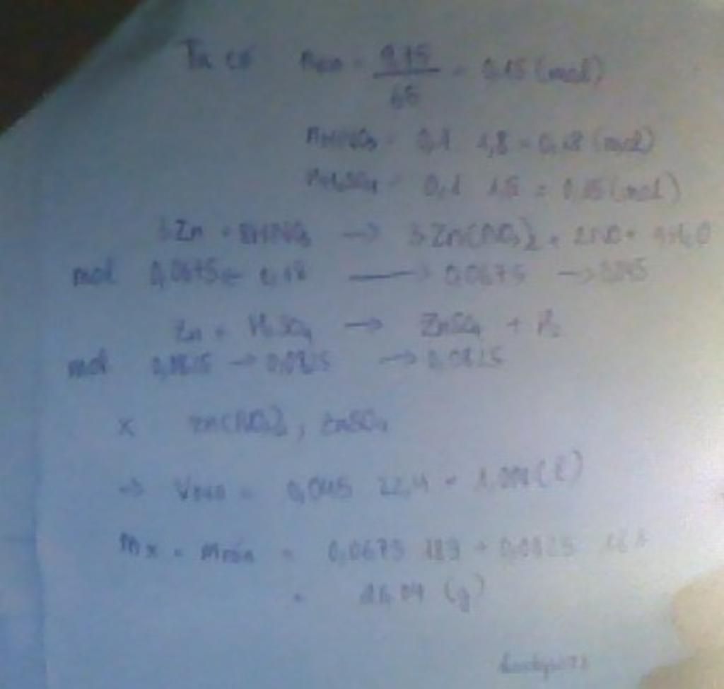Hòa tan 9.75g Zn vào 100 ml dung dịch hỗn hợp HNO₃ 1.8 M và H₂SO₄ 1.5M, sau phản ứng thu được V lít khí NO ở đktc và dung dịch X. Cô cạn dung dịch X thu được m gam muối khan. Tính V và m?