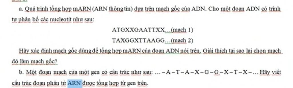 a. Quá trình tổng hợp mARN (ARN thông tin) dựa trên mạch gốc của ADN. Cho một đoạn ADN có trình