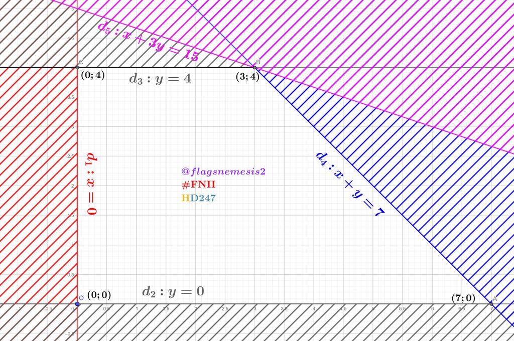 Đặt $\begin {cases} d_1: x = 0 \\ d_2: y = 0 \\ d_3: y = 4 \\ d_4: x + y = 7 \\ d_5: x + 3y = 15 \end {cases}$