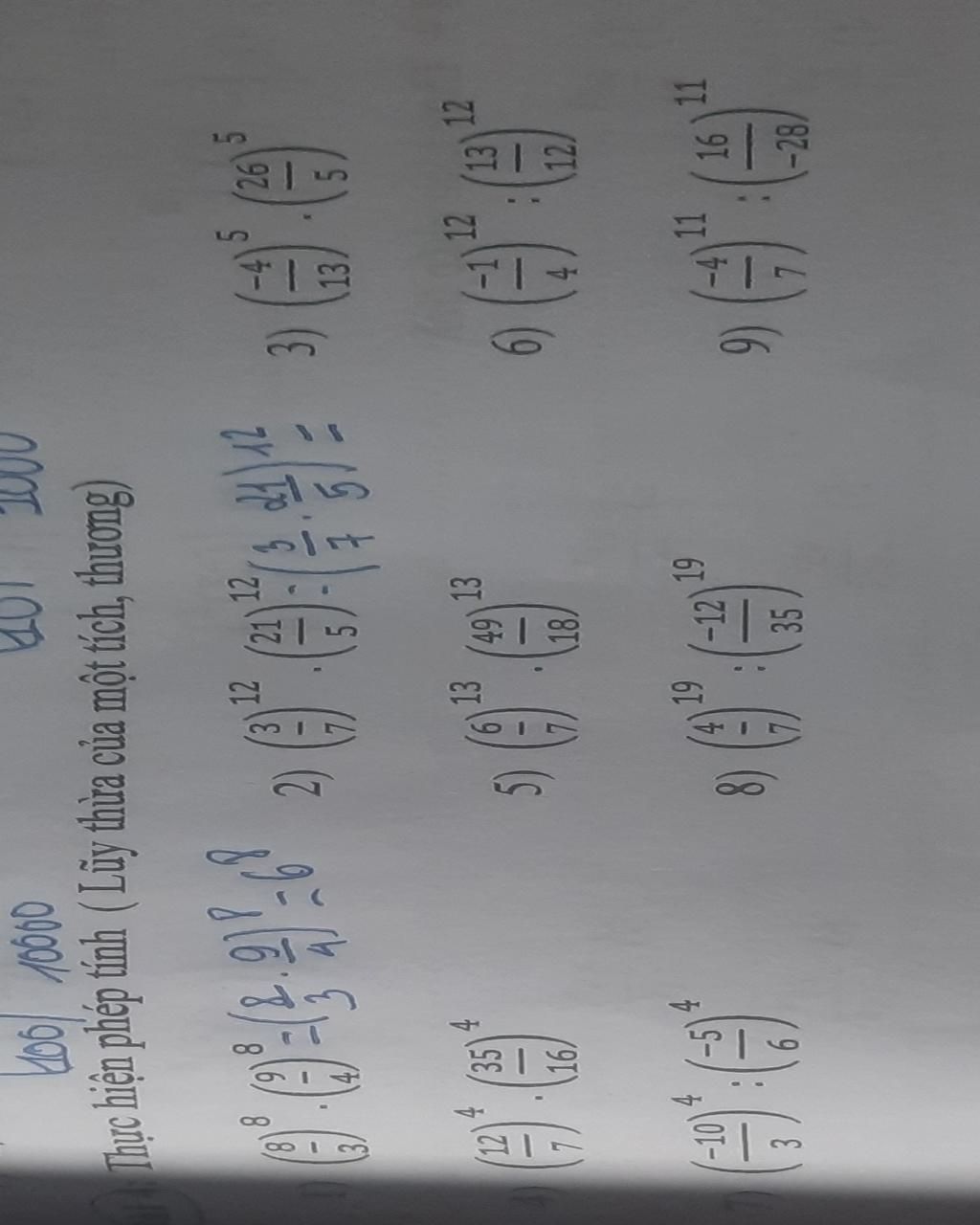 Đáp án:2, (3/7)^12 . (21/5)^12 = (3/7.21/5)^12 = (3.21/7.5)^12= (3.3.7/7.5)^12 = (9/5)^12 / 3, (-4/13)^5 . (26/5)^5 = (-4/13.26/5)^5 = (-4.13/26.5)^5 = (-2.2.13/13.2.5)^5 = (-2/5)^5 / 4, (12/7)^4 . (35/16)^4 = (12/7.35/16)^4 = (12.35/7.16)^4 = (4.3.7.5/7.4.4)^4 = (15/4)^4 / 5, (6/7)^3 . (49/ 18)^3 = (6/7.49/18)^3 = (6.49/7.18)^3 = (6.7.7/7.6.3)^3 = (7/3)^3 / 6, (-1/4)^12 : (13/12)^12 = (-1/4:13/12)^12 = (-1/4.12/13)^12 = (-1.12/4.13) = (-1.4.3/4.13) = (-3/13)^12 7, (-10/3)^4 : (-5/6)^4 = (-10/3:-5/6)^4 = (-10/3.-6/5)^4 = [-10.(-6)/3.5]^4 = [-2.5.(-2).3/3.5]^4 =6^4