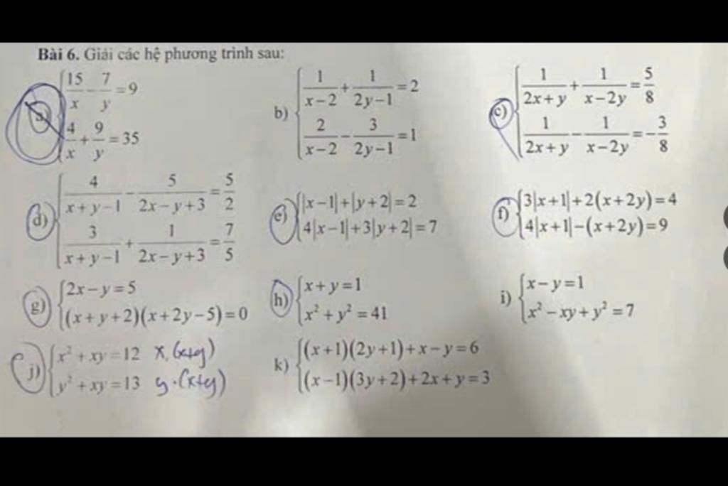 $\text{Câu k. Giải hệ phương trình:}$ \begin{cases} (x+1)(2y+1) + x - y = 6 \\ (x-1)(3y+2) + 2x + y = 3 \end{cases} $\text{Khai triển phương trình (1):}$ $(x+1)(2y+1) + x - y = 6 \\$ $2xy + x + 2y + 1 + x - y = 6 \\ 2xy + 2x + y = 5 \quad \text{(1')}$ $\text{Khai triển phương trình (2):}$ $(x-1)(3y+2) + 2x + y = 3 \\ 3xy + 2x - 3y - 2 + 2x + y = 3 \\ 3xy + 4x - 2y = 5 \quad \text{(2')}$ $\text{Từ (1'): } y = 5 - 2xy - 2x \\ \text{Thay vào (2'):}$ $ 3xy + 4x - 2(5 - 2xy - 2x) = 5 \\ 3xy + 4x - 10 + 4xy + 4x = 5 \\ 7xy + 8x = 15$ $\text{Đặt } A = xy. Ta có: \\ 7A + 8x = 15 \Rightarrow A = \dfrac{5x - 2x^2}{1 + 2x}$ $\text{Thay lại:} \\ 7 \cdot \dfrac{5x - 2x^2}{1 + 2x} + 8x = 15 \\ \dfrac{43x + 2x^2}{1 + 2x} = 15 \\ \Rightarrow 43x + 2x^2 = 15 + 30x \\ \Rightarrow 2x^2 + 13x - 15 = 0$ $\text{Giải phương trình:} \\ x = \dfrac{-13 \pm \sqrt{289}}{4} = \dfrac{-13 \pm 17}{4} \\ \Rightarrow x = 1 \text{ hoặc } x = -\dfrac{15}{2}$ $\text{Với } x = 1: \\ 2y + 2 + y = 5 \Rightarrow 3y = 3 \Rightarrow y = 1 \Rightarrow (x, y) = (1, 1)$ $\text{Với } x = -\dfrac{15}{2}: \\$ $-15y -15 + y = 5 \Rightarrow -14y = 20 \Rightarrow y = -\dfrac{10}{7} \\ \Rightarrow (x, y) = \left( -\dfrac{15}{2}, -\dfrac{10}{7} \right)\\ \text{Vậy nghiệm của hệ là: } (x, y) = (1, 1) \text{ hoặc } \left( -\dfrac{15}{2}, -\dfrac{10}{7} \right)$