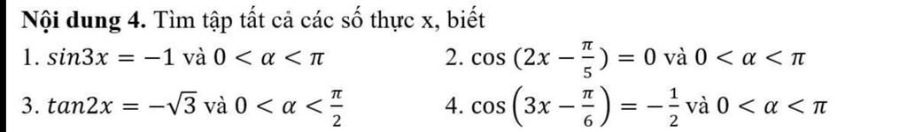 `4,` `cos(3x-pi/6) = -1/2` và `0 < alpha < pi`