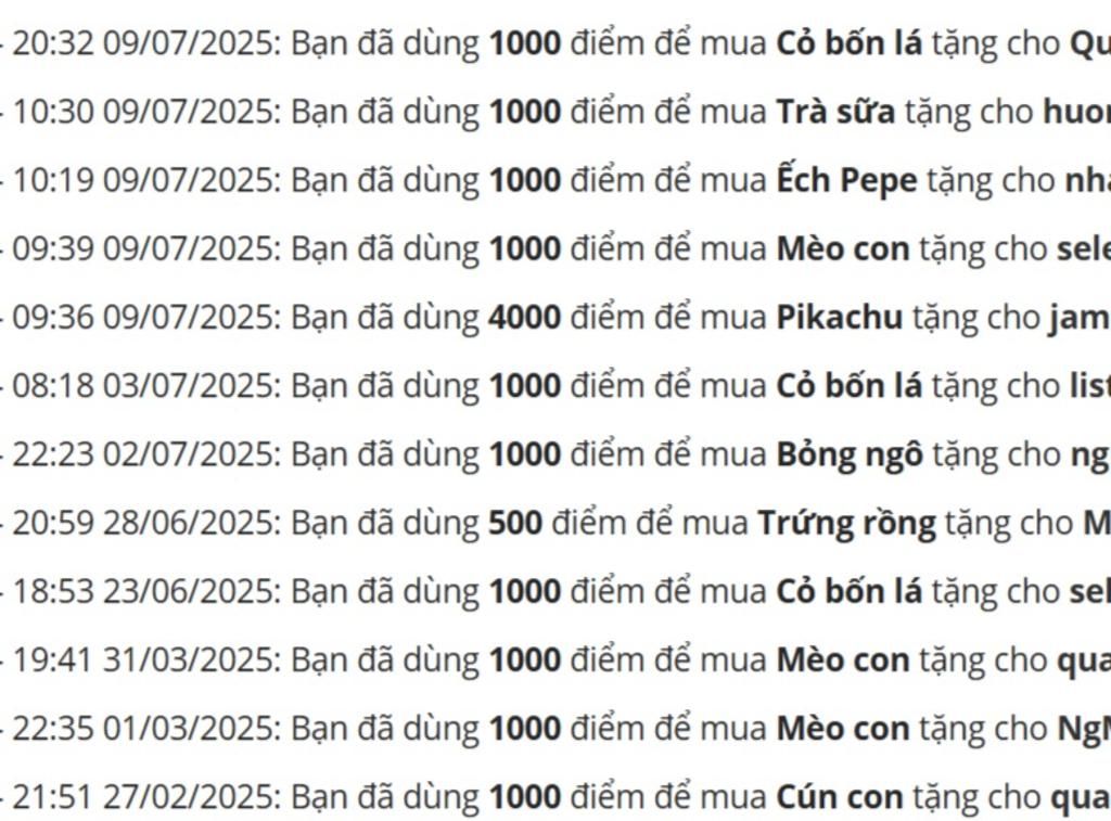 10:30 09/07/2025: Bạn đã dùng 1000 điểm để mua Trà sữa tặng cho huo