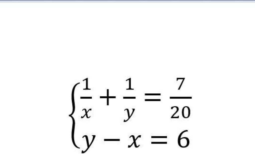 `{( 1/x + 1/y = 7/20 ( 1 )),( y - x = 6 ( 2 )):}`