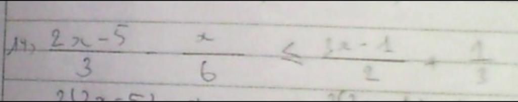 `(2(2x-5))/6-x/6≤(3(3x-1))/6+2/6`