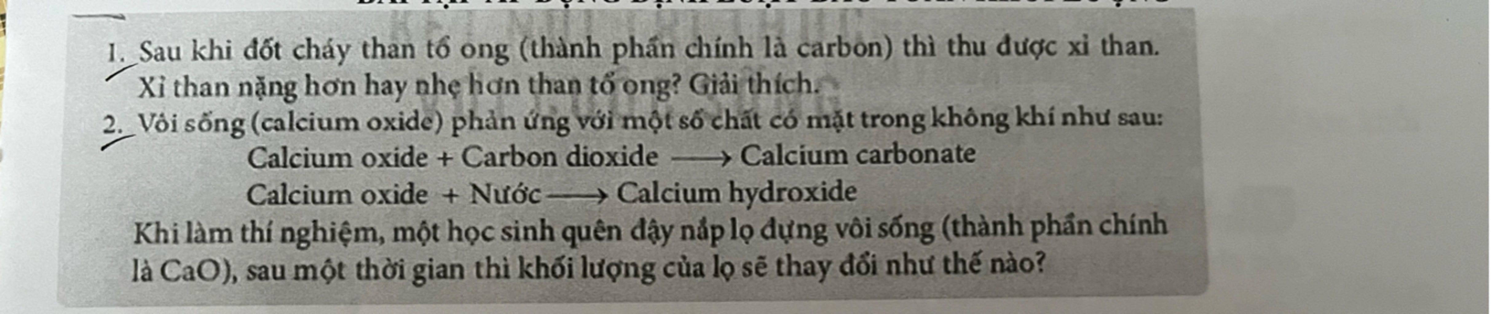 Khối lượng của xỉ than sẽ nặng hơn khối lượng của tổ ong vì khi đốt tổ ong chủ yếu là $\rm C$ sẽ có phản ứng với $\rm O_2$ tạo thành $\rm CO, CO_2$ khối lượng tăng do có thêm khối lượng $\rm [O]$
