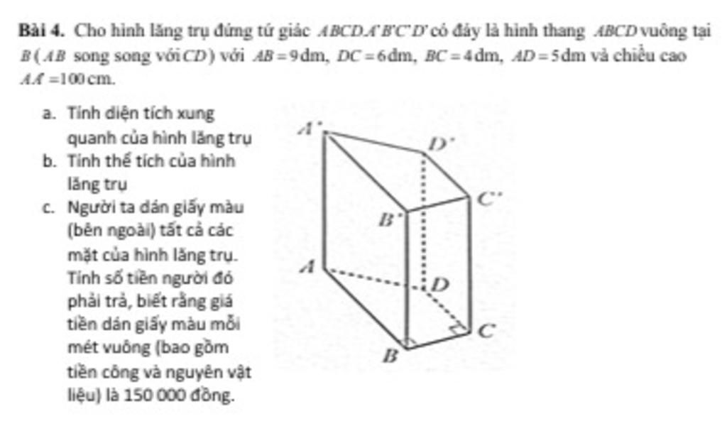 Vậy: `a) 24 000 cm^2; b) 300 000 cm^3;c) 450 000` đồng