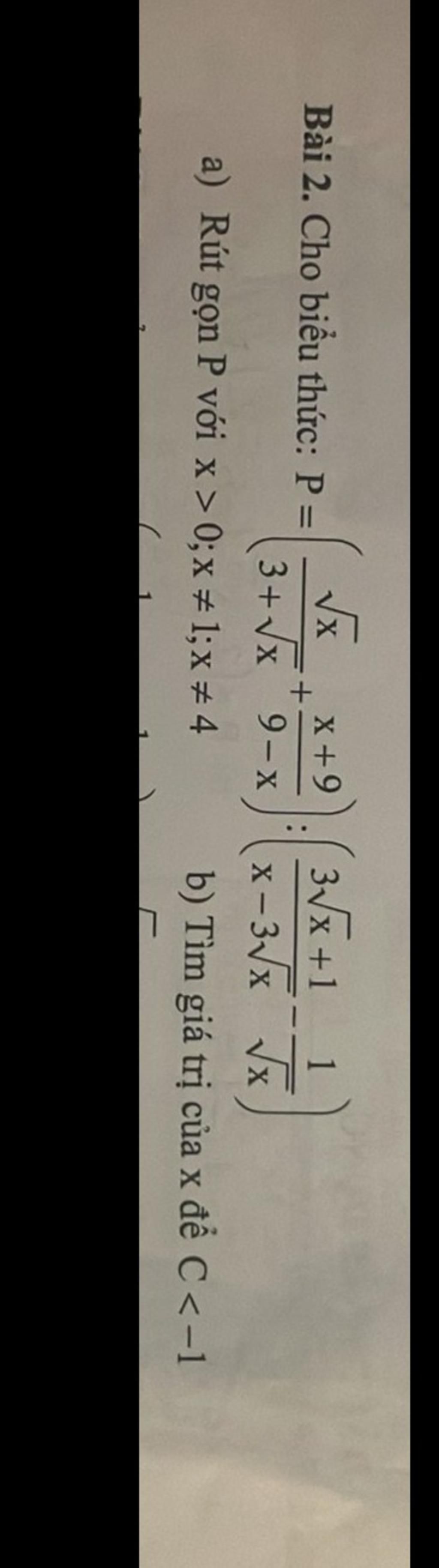`P = ((sqrt(x)(3-sqrt(x)))/((3+sqrt(x))(3-sqrt(x))) + (x+9)/((3-sqrt(x))(3+sqrt(x)))) : ((3sqrt(x)+1)/(sqrt(x)(sqrt(x)-3)) - (sqrt(x)-3)/(sqrt(x)(sqrt(x)-3)))`