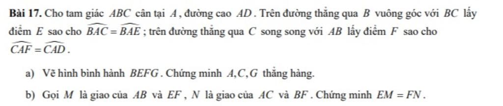 Bài 17. Cho tam giác ABC cân tại A, đường cao AD . Trên đường thẳng qua B vuông góc với BC lấy