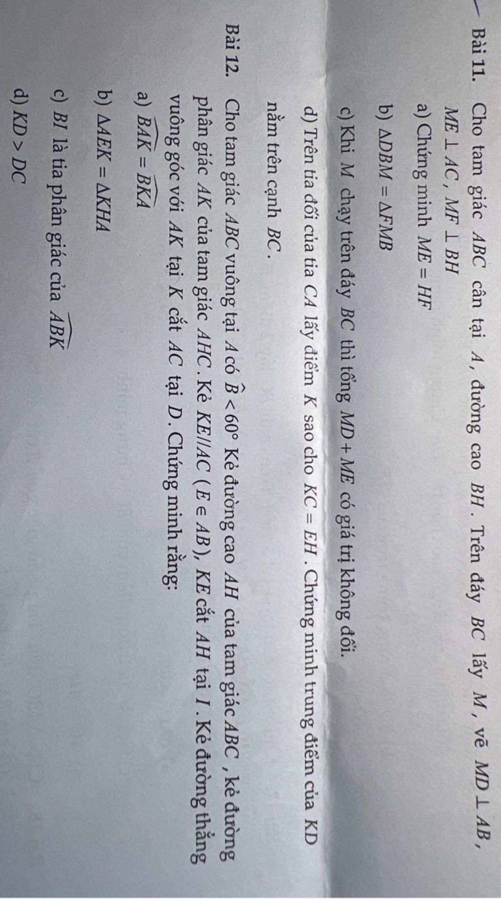 Bài 11. Cho tam giác ABC cân tại A, đường cao BH. Trên đáy BC lấy M, vẽ MD LAB,