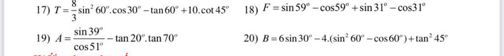 $ T = \frac{8}{3}\sin^2{60^\circ}\cos{30^\circ} - \tan{60^\circ} + 10\cot{45^\circ} $