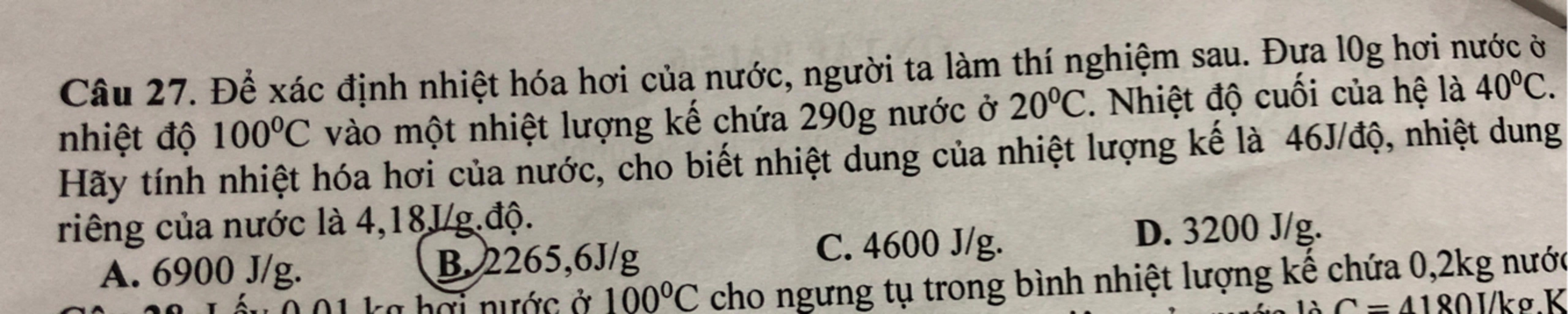 `-> mL + m * c * (100 - 40) = Q_(\"thu") => 10L + 10 * 4,18 * 60 = 25164 => 10L + 2508 = 25164 => 10L = 22656 => L = 2265,6 J//g`