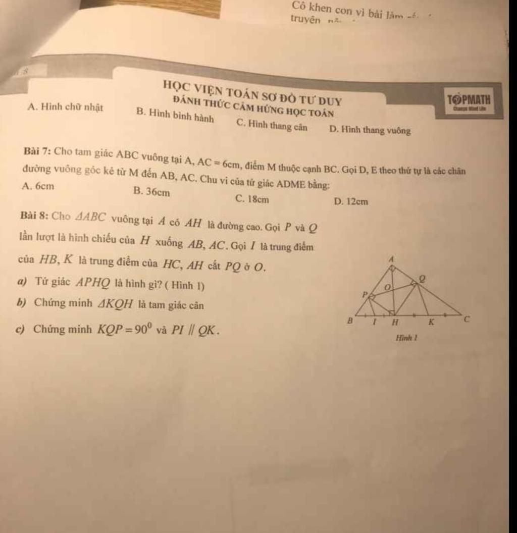 Bài 7: Cho tam giác ABC vuông tại A, AC = 6cm, điểm M thuộc cạnh BC. Gọi D, E theo thứ tự là các ch ...