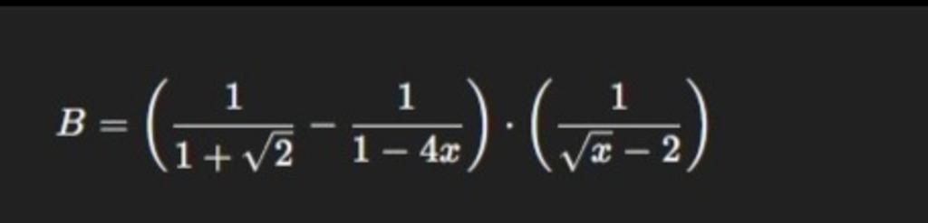 `B = ( 1/(1+sqrt2) - 1/(1-4x) ) . ( 1/(sqrtx-2) )` `(` ĐK `:` `x >=0 ;x \ne 1/4 ; x\ne 4` `)`
