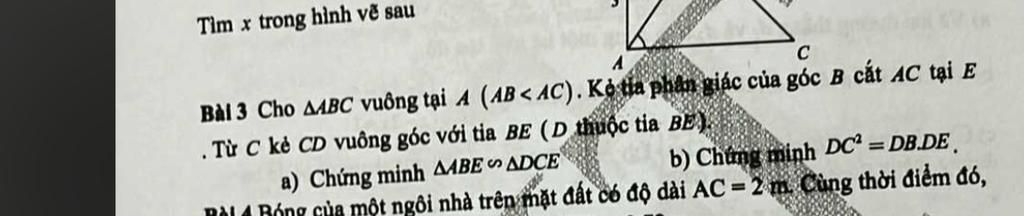 Bài 3 Cho AABC vuông tại A (AB < AC). Kẻ tia phân giác của góc B cắt AC tại E