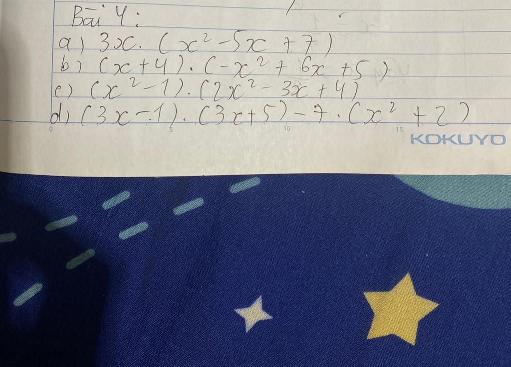 d) `(3x-1)(3x+5)-7(x^2+2)`