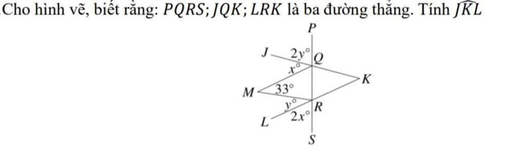 `=> hat{JKL} = 180^o - 2. 71^o = 38^o`