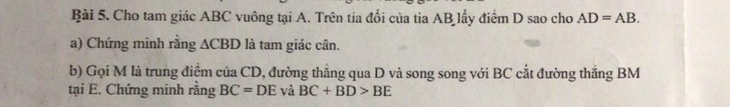`b)` Cm `BC = DE`, `BC + BD > BE`