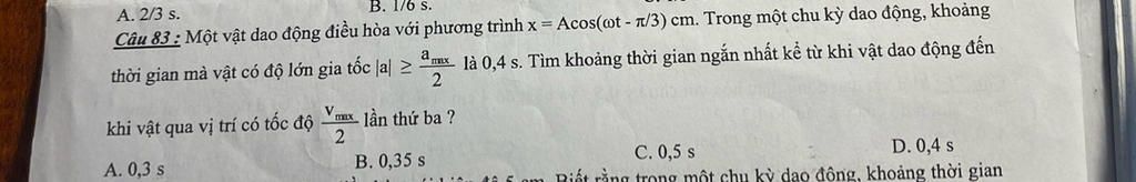 Trong 1 chu kỳ, thời gian mà vật có độ lớn gia tốc \(\left| a \right| \ge \dfrac{{{a_{\max }}}}{2}\) là: