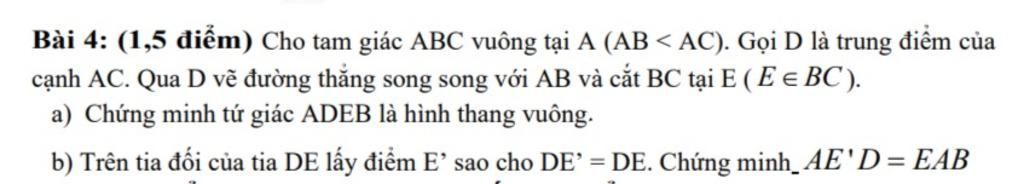 b) Trên tia đối của tia DE lấy điểm E’ sao cho DE’ = DE. Chứng minh_AE'D = EAB