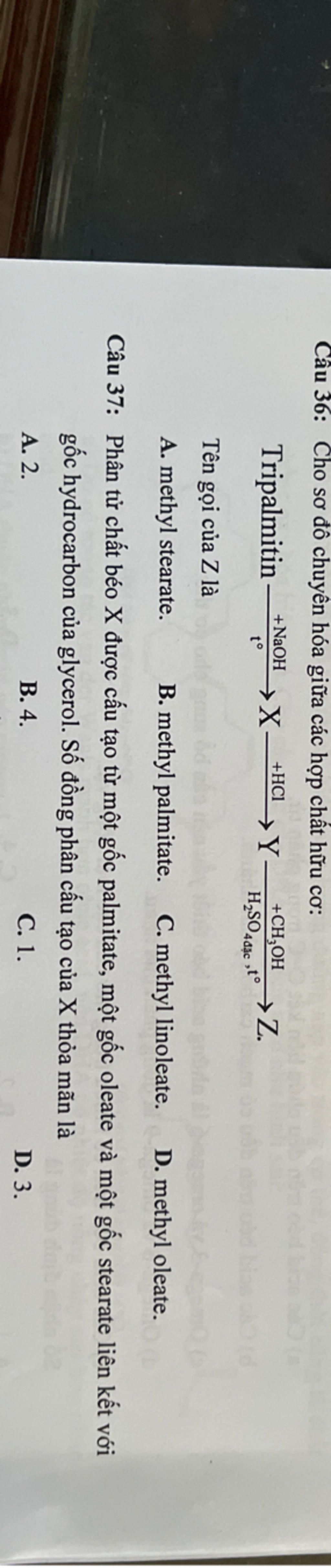 `C_15H_31COOH+CH_3OH` $\xrightarrow[t^o]{H_2SO_4(đ)}$ `C_15H_31COOCH_3+H_2O`