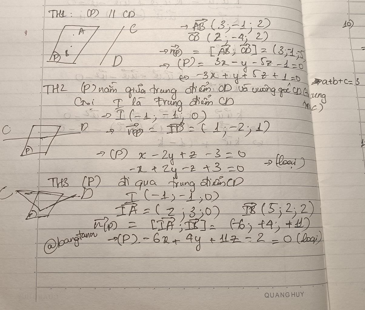 Câu 1. Trong không gian Oxyz, mặt phẳng (p) qua hai điểm A(1; 2; 0) , B(4; 1; 2) và cách đều hai điểm C(- 2; 1; - 1) D(0, - 3, 1) có dạng ax + by + cz + 1 = 0(a < 0) . Tính P = a + b + c
