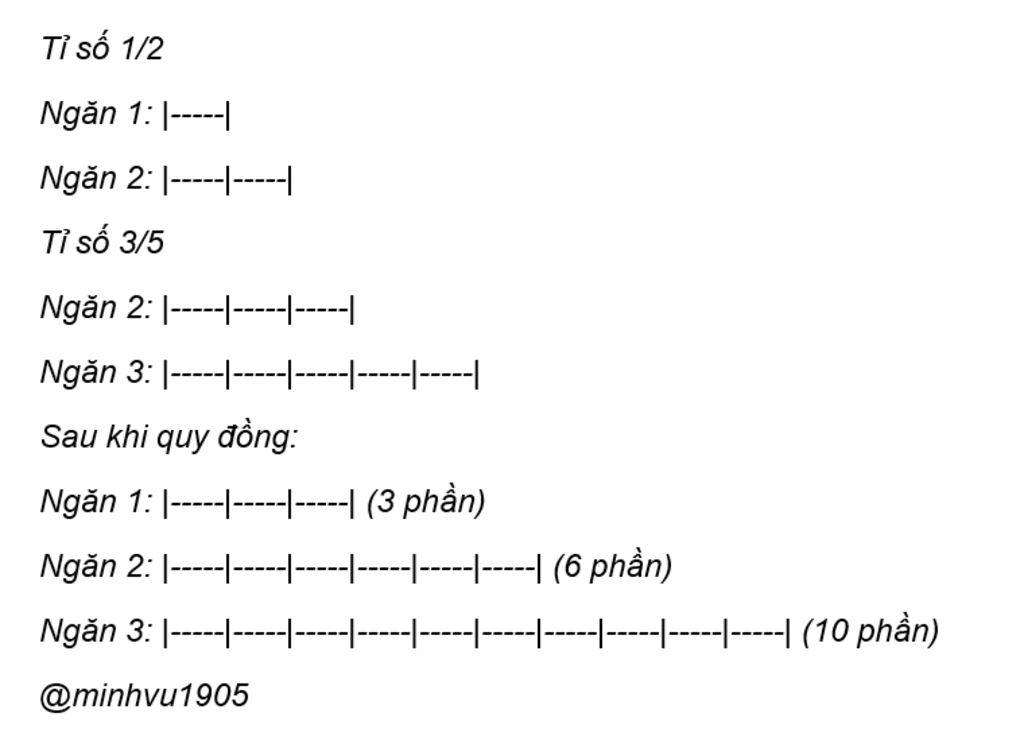 Ta quy đồng để có cùng tỉ số cho cả 3 ngăn: $\frac{1}{2}$ = $\frac{3}{6}$ (nhân cả 2 số với 3)