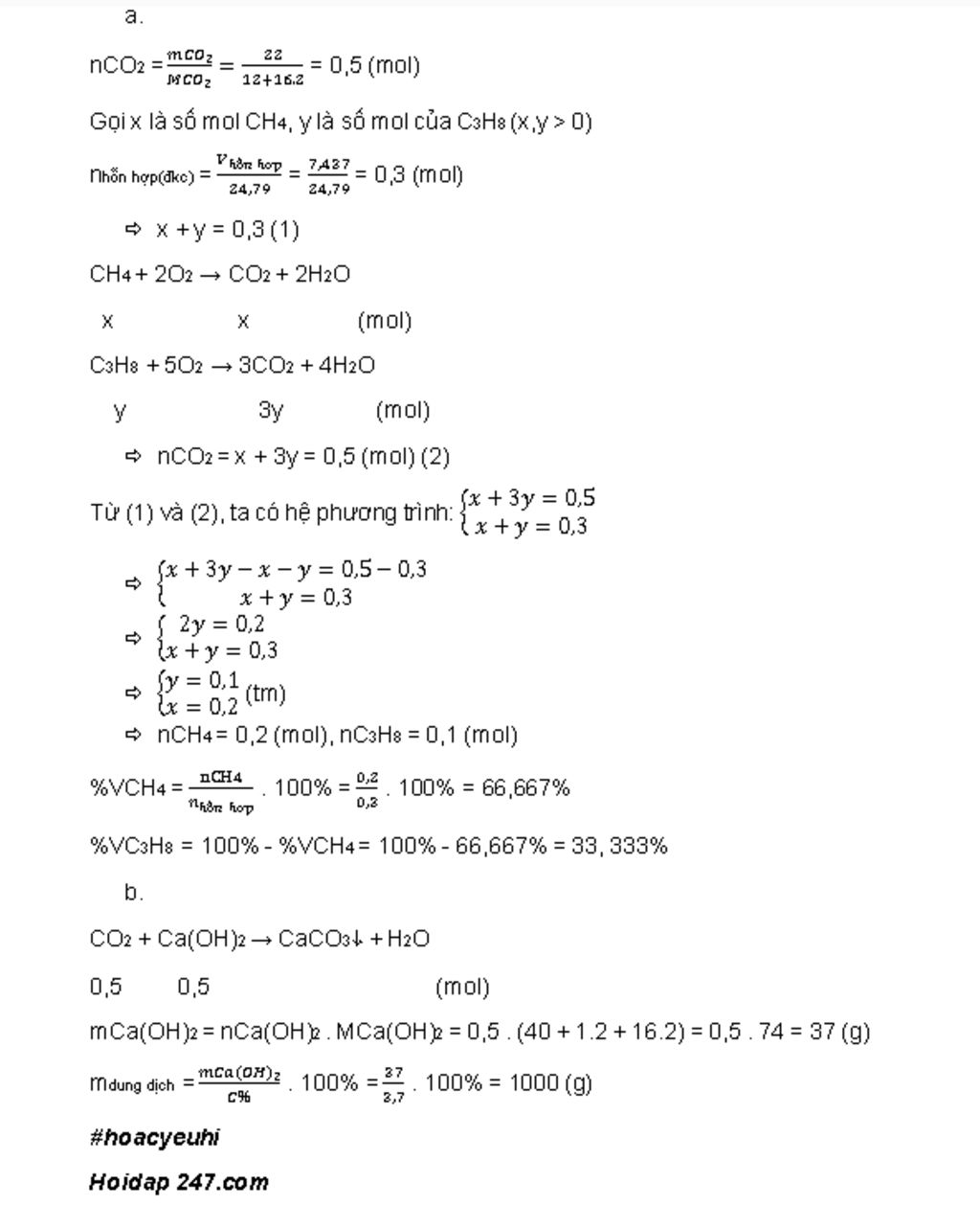b. Dẫn sản phẩm qua nước vôi trong dư, tính KL dd `Ca(OH)_2` `3,7%` cần phản ứng.