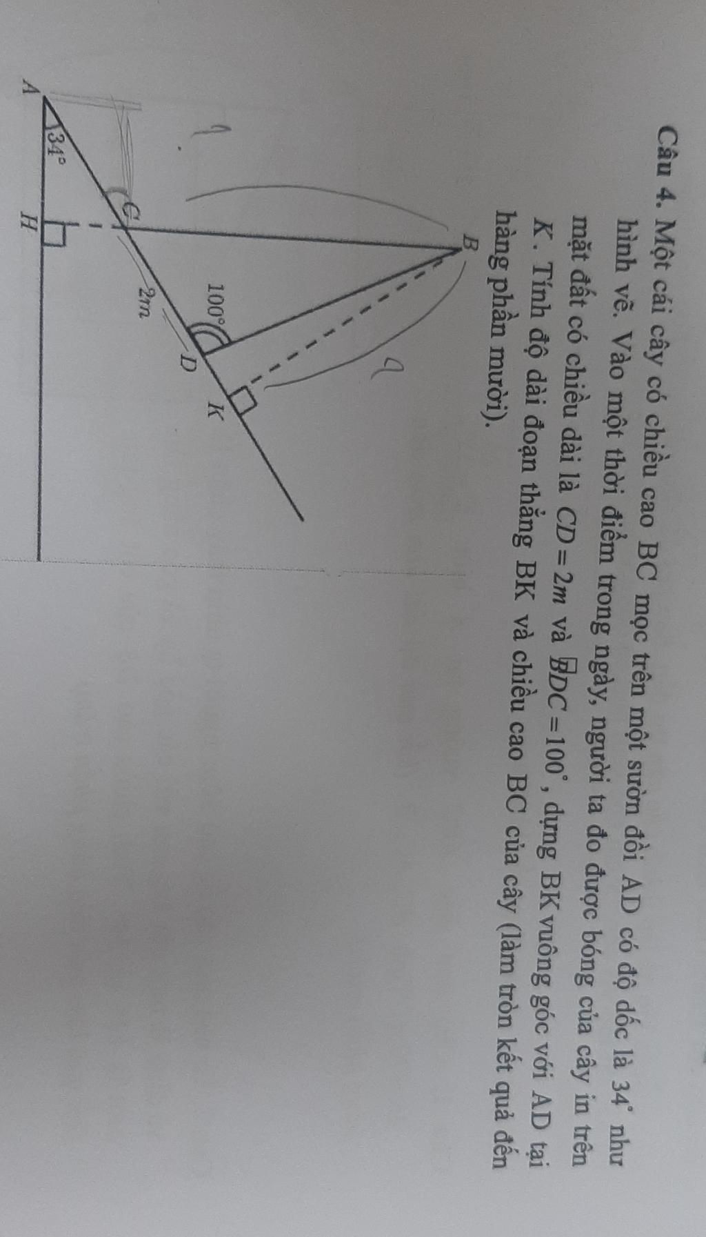 Câu 4. Một cái cây có chiều cao BC mọc trên một sườn đồi AD có độ dốc là 34 như