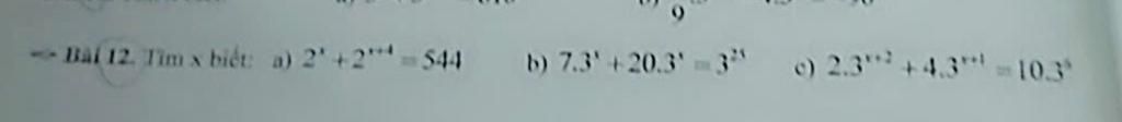 `c) 2 . 3^(x + 2) + 4 . 3^(x + 1) = 10. 3^6`