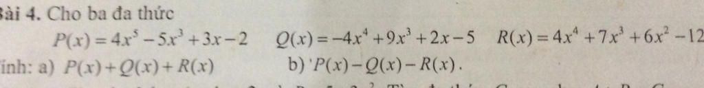 `b, P(x) - Q(x) - R(x) = 4x^5 - 5x^3 + 3x - 2 + 4x^4 - 9x^3 -2x + 5 - 4x^4 - 7x^3 - 6x^2 + 12`