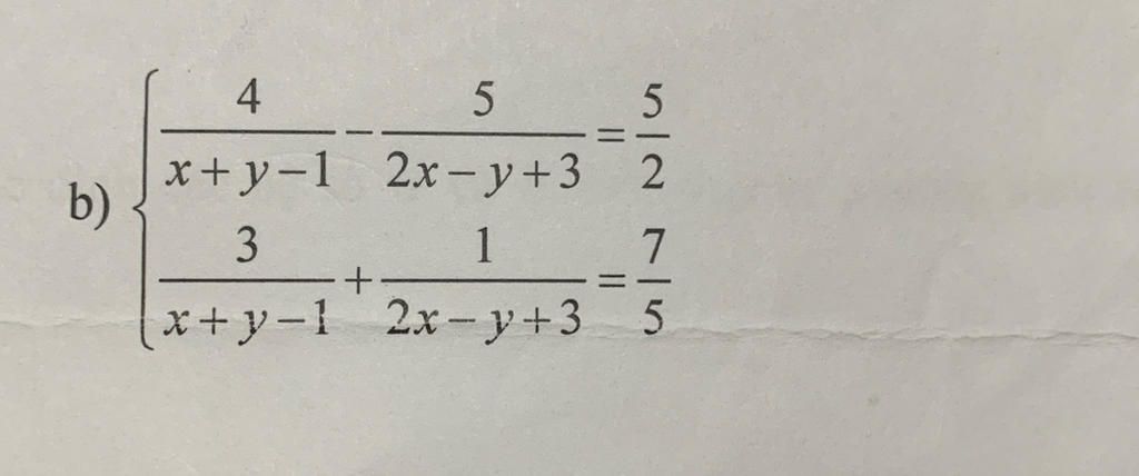 \begin{align*} &\text{Giải hệ phương trình:} \\ &\begin{cases} \displaystyle \frac{4}{x + y - 1} - \frac{5}{2x - y + 3} = \frac{5}{2} \\ \displaystyle \frac{3}{x + y - 1} + \frac{1}{2x - y + 3} = \frac{7}{5} \end{cases} \\[1em] &\text{Đặt } u = \frac{1}{x + y - 1}, \quad v = \frac{1}{2x - y + 3} \Rightarrow \begin{cases} 4u - 5v = \frac{5}{2} \\ 3u + v = \frac{7}{5} \end{cases} \\[1em] &\text{Từ phương trình dưới: } v = \frac{7}{5} - 3u \\ &\text{Thay vào phương trình trên: } 4u - 5\left(\frac{7}{5} - 3u\right) = \frac{5}{2} \\ &\Rightarrow 4u - 7 + 15u = \frac{5}{2} \\ &\Rightarrow 19u = \frac{5}{2} + 7 = \frac{19}{2} \Rightarrow u = \frac{1}{2} \\ &\Rightarrow v = \frac{7}{5} - 3 \cdot \frac{1}{2} = \frac{7}{5} - \frac{3}{2} = \frac{14 - 15}{10} = -\frac{1}{10} \\[1em] &\text{Khi đó: } \frac{1}{x + y - 1} = \frac{1}{2} \Rightarrow x + y - 1 = 2 \Rightarrow x + y = 3 \\ &\phantom{\text{Khi đó: }} \frac{1}{2x - y + 3} = -\frac{1}{10} \Rightarrow 2x - y + 3 = -10 \Rightarrow 2x - y = -13 \\[1em] &\text{Giải hệ:} \begin{cases} x + y = 3 \\ 2x - y = -13 \end{cases} \Rightarrow \text{Cộng hai phương trình: } 3x = -10 \Rightarrow x = -\frac{10}{3} \\ &\Rightarrow y = 3 - x = 3 + \frac{10}{3} = \frac{19}{3} \\[1em] &\text{Vậy nghiệm của hệ là: } \boxed{x = -\frac{10}{3},\ y = \frac{19}{3}}. \end{align*}
