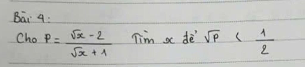 vậy để $\sqrt{P}<\frac{1}2$ thì x<9;x≥4