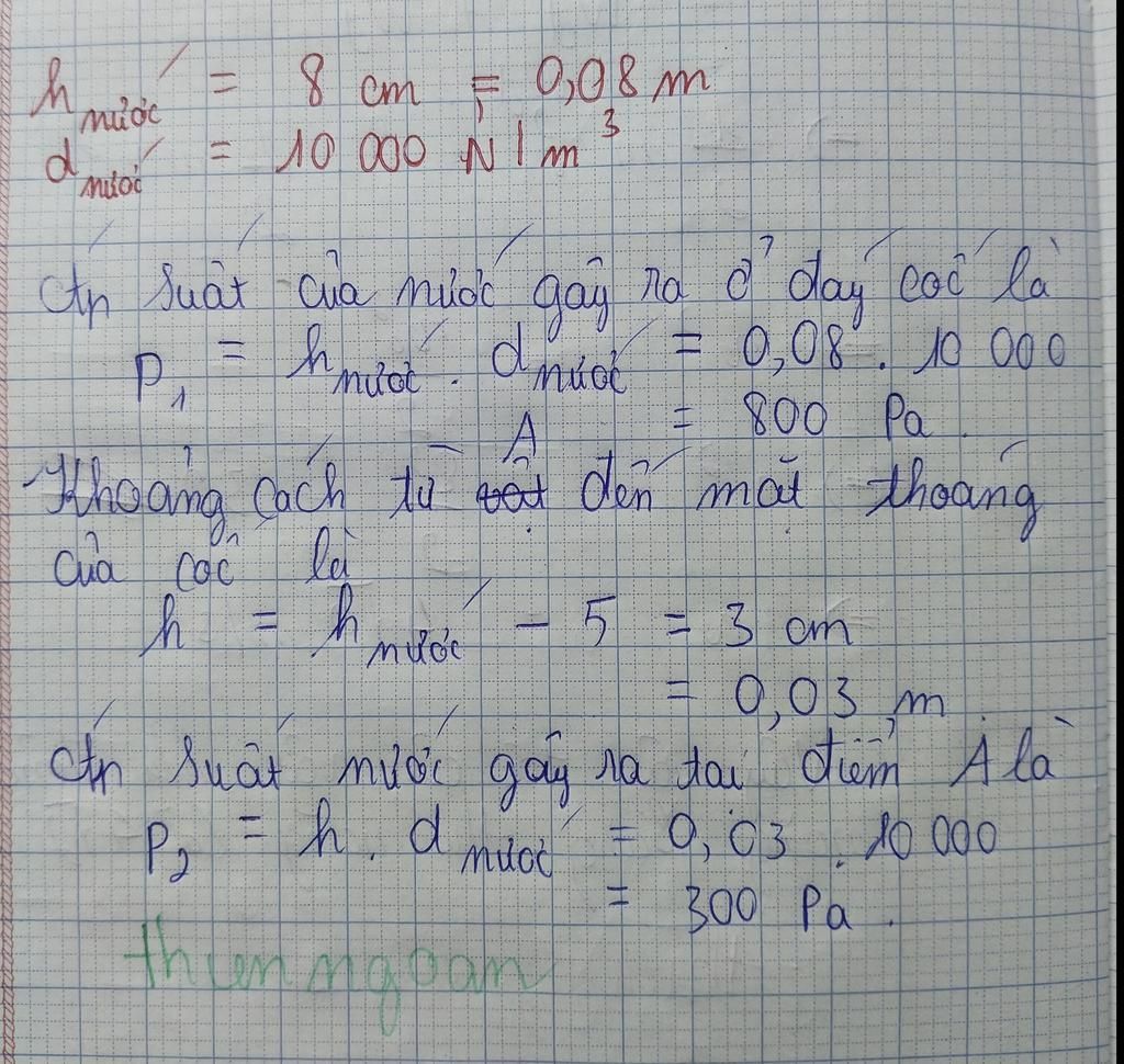 Bài 189: Đổ một lượng nước vào trong cốc sao cho độ cao của nước trong cốc là 8cm. Tính áp suất của nước lên đáy cốc và lên một điểm A cách đáy cốc 5cm. Biết trọng lượng riêng của nước là 10000 N/m³.