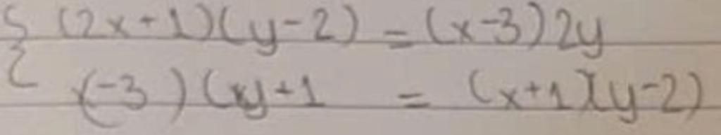 $\begin{cases} (2x+1)(y-2)=(x-3)2y\\(x-3)(y+1)=(x+1)(y-2) \end{cases}$
