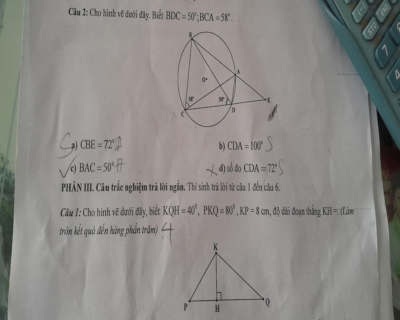 $\widehat{CBE}=180^o-\widehat{A}-\widehat{C}=180^o-50^o-58^o=72^o$