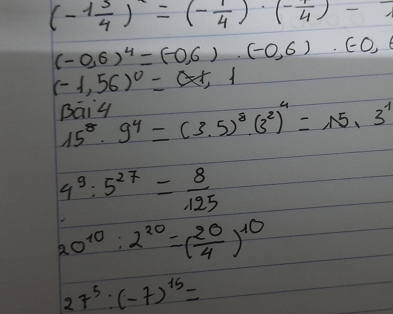 $27^5:(-7)^{15}=(3^3)^5:(-7)^{15}=3^{15}:(-7)^{15}=(\dfrac3{-7})^{15}$