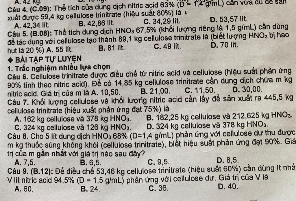 Xét mắt xích của cellulose trinitrate là `C_6H_7O_2(NO_3)_3` và mắt xích của cellulose là `C_6H_{10}O_5`