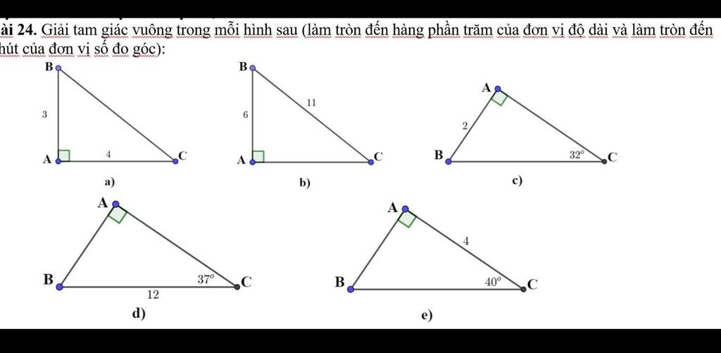 ài 24. Giải tam giác vuông trong mỗi hình sau (làm tròn đến hàng phần trăm của đơn vị độ dài và làm tròn đến